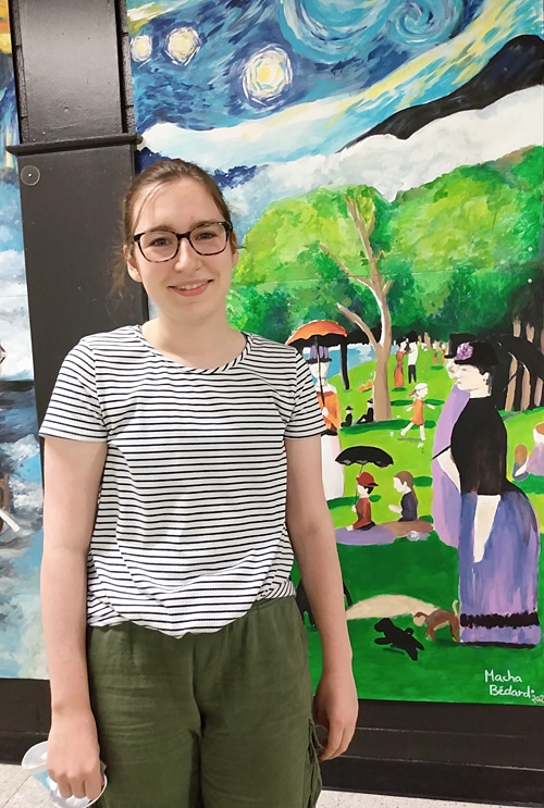 Ce n’est pas tout. À Paul-Le Jeune, Macha Bédard a réalisé au cours de la dernière année deux murales dont celle des arts plastiques où elle s’est appliqué à faire des clins d’œil littéralement aux grands noms de la peinture: Van Gogh, Seurat, Rembrandt et autres.